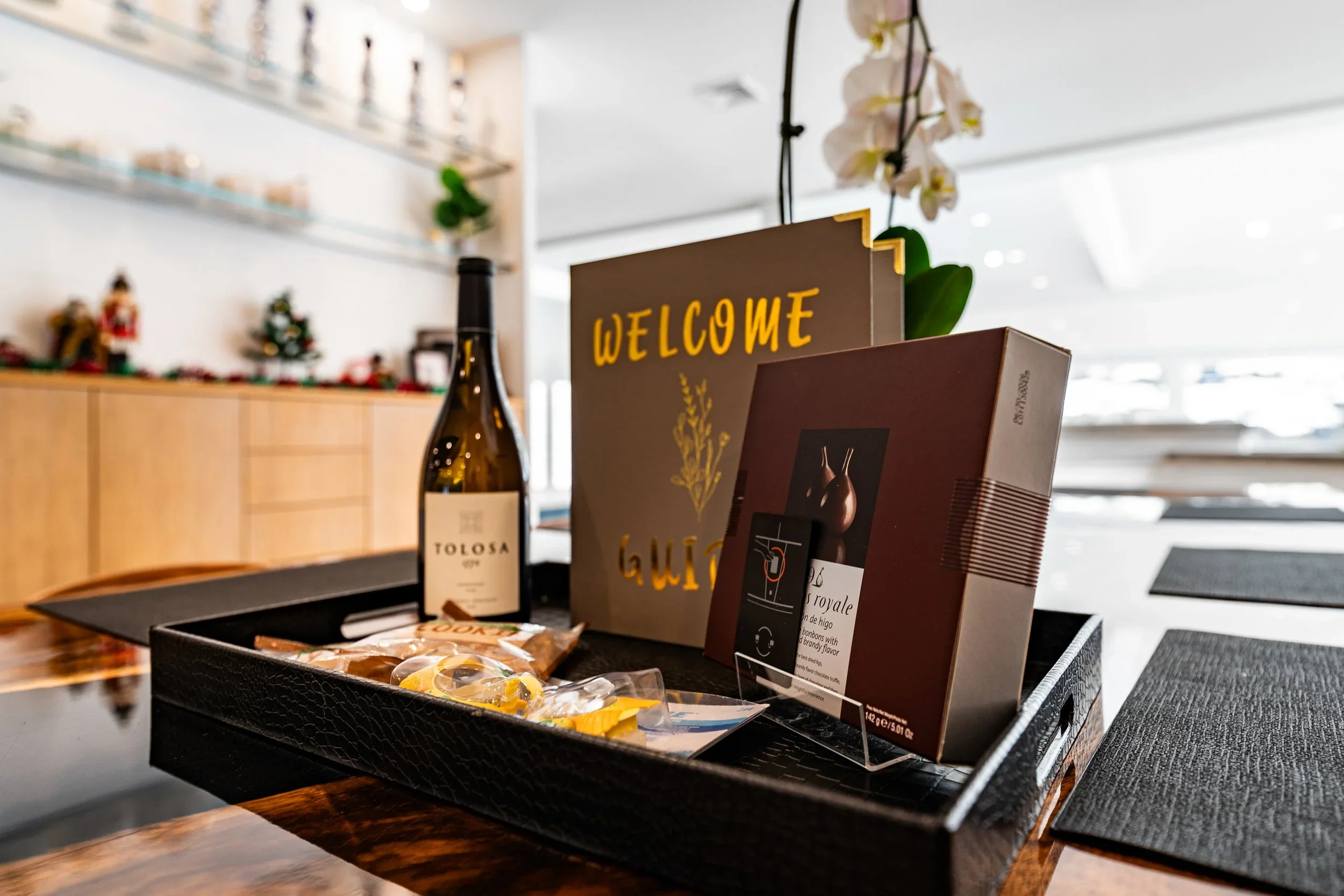 After: A curated welcome display. Wine, artisan chocolates, a branded card, and an orchid set against the clean lines of the renovated interior. This is the kind of detail image that most builders never capture, and it is exactly the kind of image that tells a prospective client everything about the standard of finish.